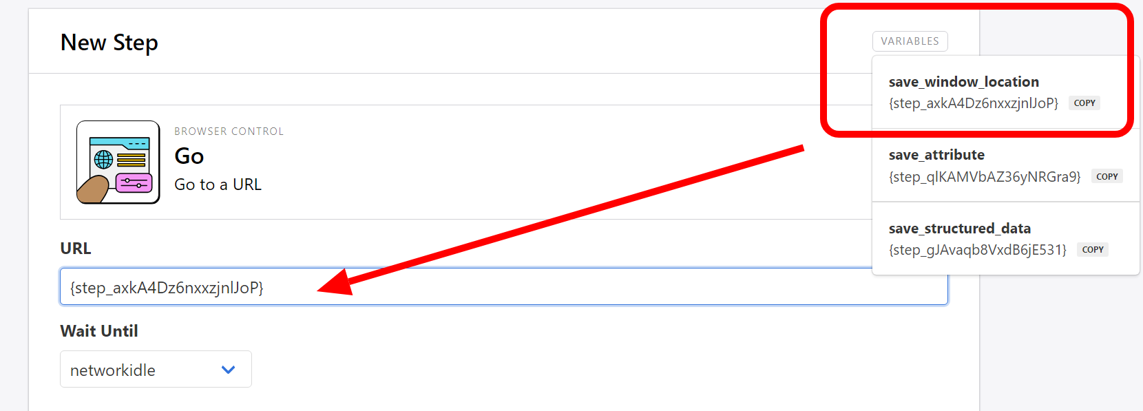 Add this action to save the current page URL and return the URL in the output feed. This is useful for when you need to go back to that page.
